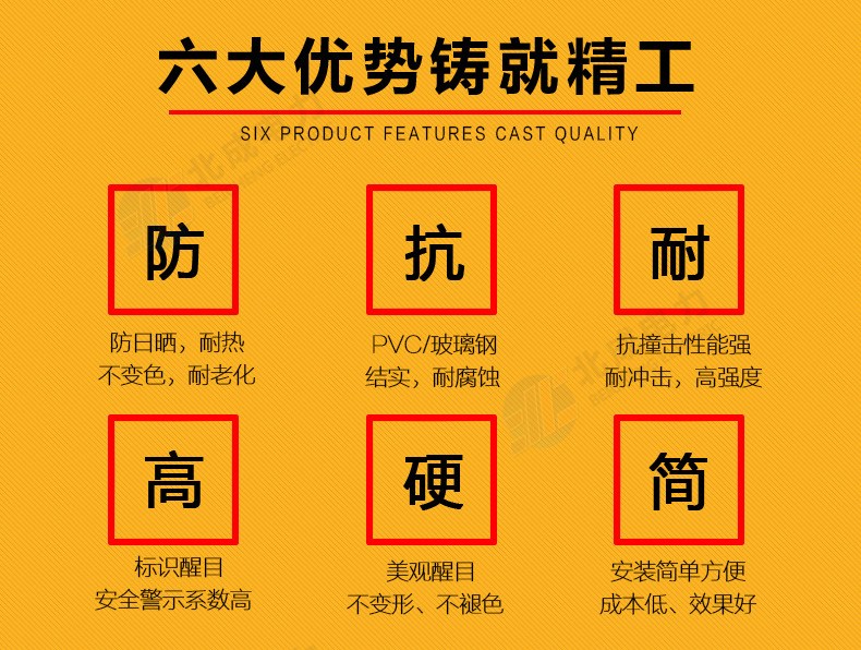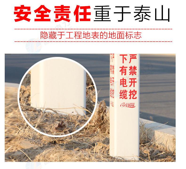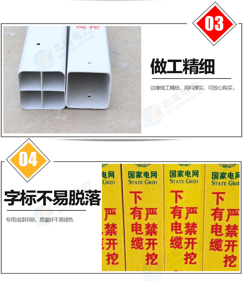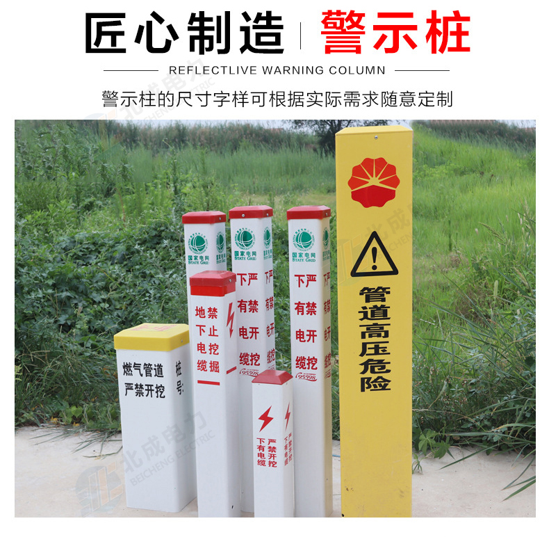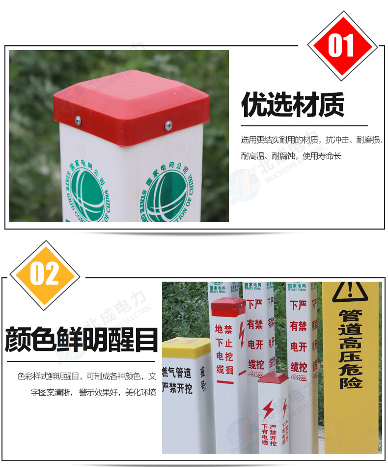 標志樁按用途分為: 電纜標志樁、油氣標志樁、通信標志樁、光纜標志樁、自來水標志樁、鐵路標志樁、公路里程樁。 性能指標: 1、拉伸強度≥160MPa 2、彎曲強度≥190MPa 3、浸水后彎曲強度≥150MPa 4、巴氏硬度≥38 5、環鋼度(5%)≥50KPa 6、熱變形溫度≥160℃ 7、氧指數26% 石家莊北成電力科技有限公司 聯系電話:17603245663(微信同號) / 0311-67593878