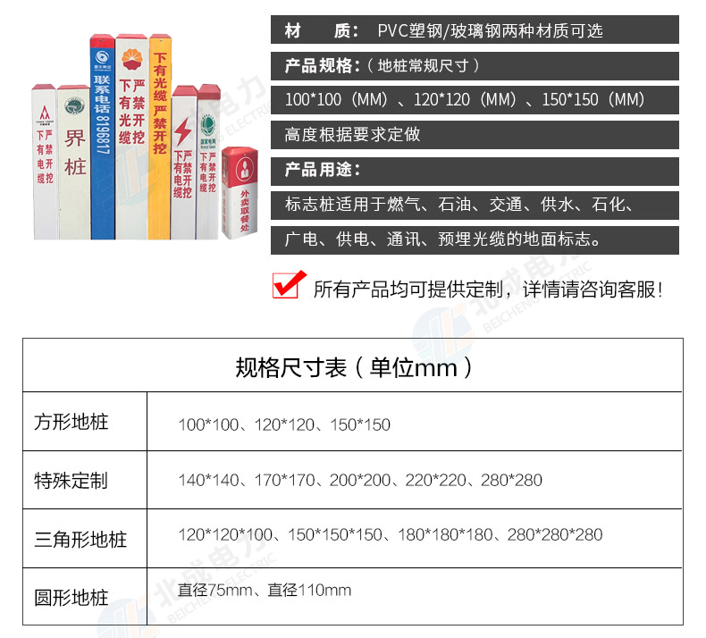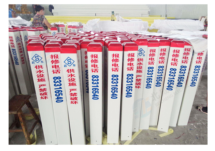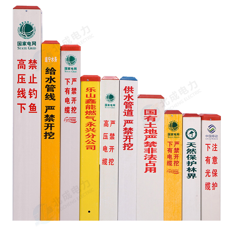 標志樁按用途分為: 電纜標志樁、油氣標志樁、通信標志樁、光纜標志樁、自來水標志樁、鐵路標志樁、公路里程樁。 性能指標: 1、拉伸強度≥160MPa 2、彎曲強度≥190MPa 3、浸水后彎曲強度≥150MPa 4、巴氏硬度≥38 5、環鋼度(5%)≥50KPa 6、熱變形溫度≥160℃ 7、氧指數26% 石家莊北成電力科技有限公司 聯系電話: 17603245663(微信同號) / 0311-67593878