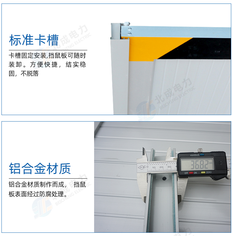 新型鋁合金材質(zhì)擋鼠板替代老式擋鼠板材,實(shí)用、結(jié)實(shí)、耐用、使用時(shí)間長。由擋鼠板主板面和卡槽夠成,外觀可見部分為鋁合金定制,且貼有黃黑色的反光警示貼。